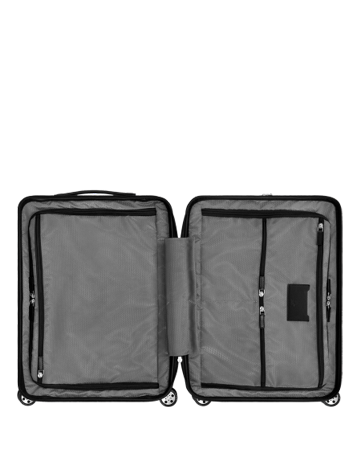 Interior organization: Spacious clothing compartment with adjustable straps and zipper closure. A flat zipper pocket and a business card pocket. As well as a lined laptop pocket and a large flat zipper pocket. There is an additional outer compartment under the telescopic handle, which fits a Montblanc power bank perfectly.