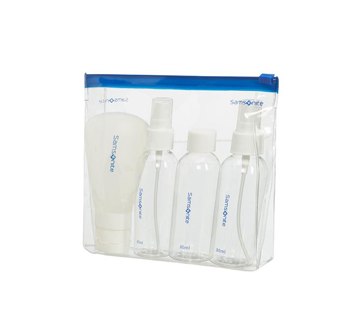 Transparent bag with zip closure. Perfect for packing toiletries. The transparent toiletry bag comes with four 100 ml containers that are approved for taking through the airport. This means you don't have to worry about repacking your liquids when you have to go through airport security.