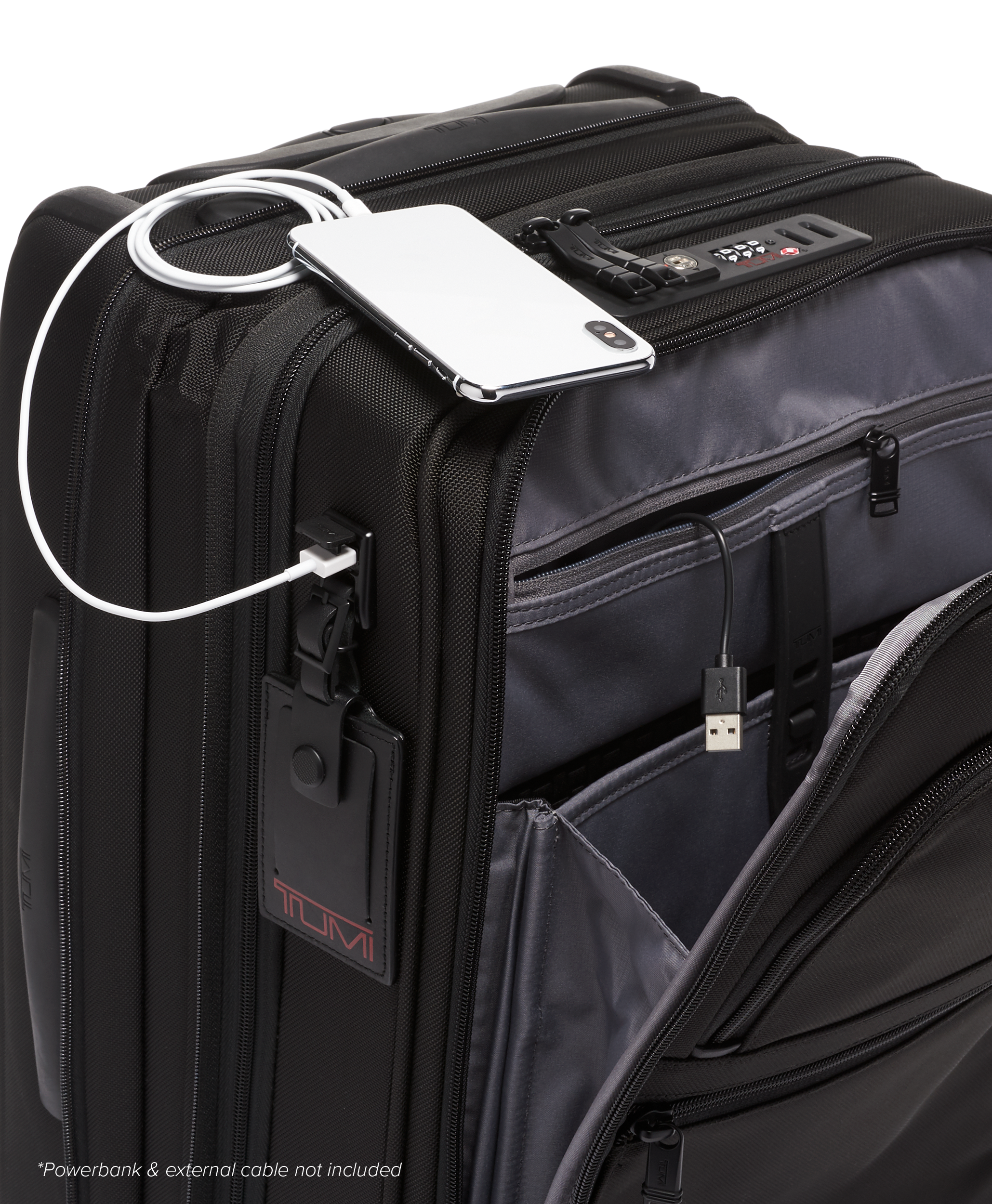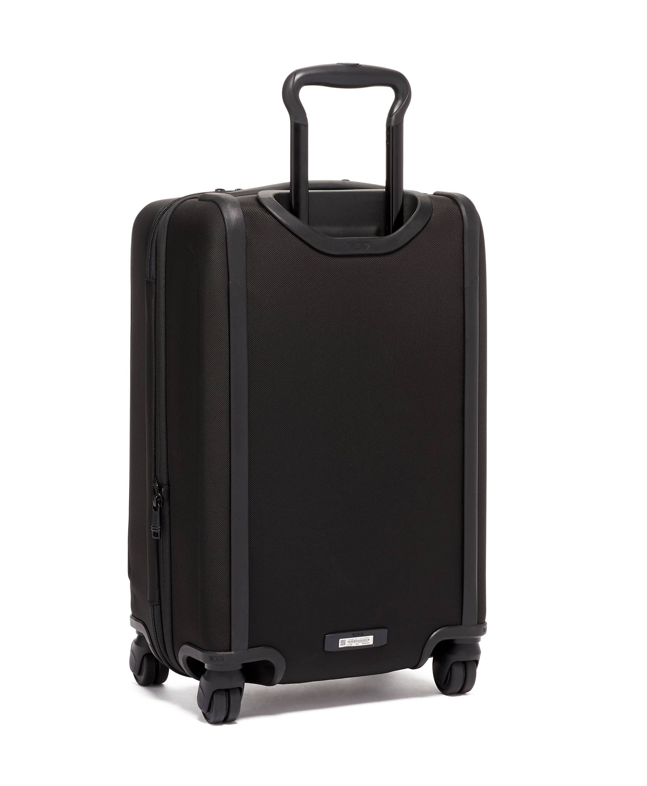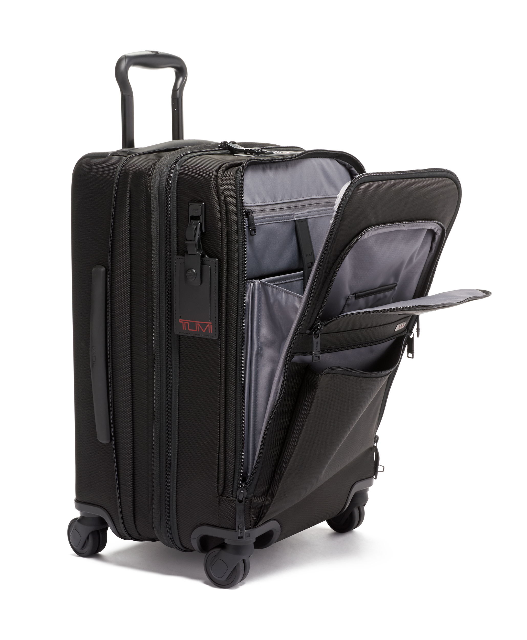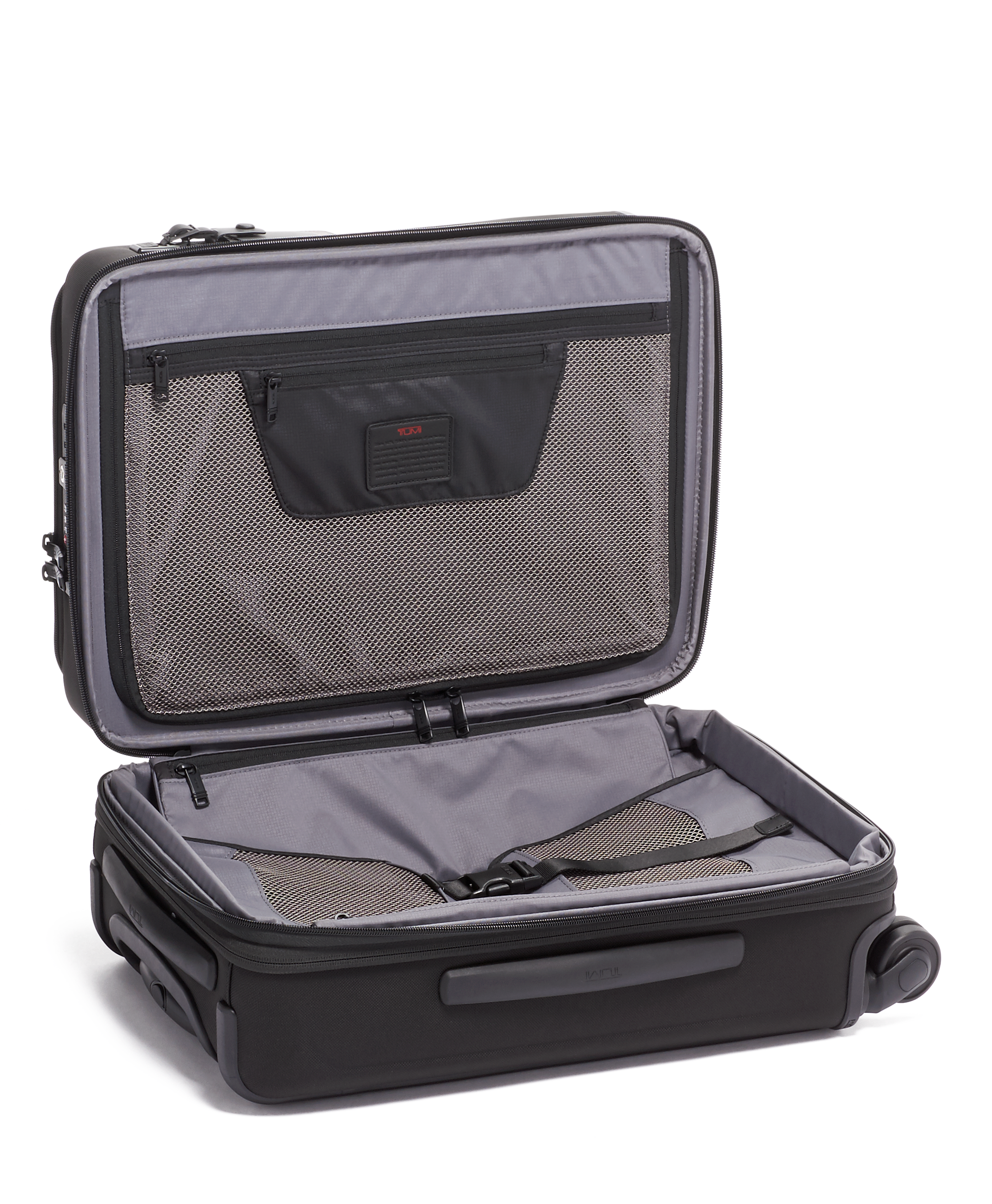The TUMI Alpha 3 International Office Carry On is premium luggage designed for business travelers. It features a durable ballistic nylon exterior, elegant leather details, and a telescoping handle for easy maneuverability. The interior of the suitcase includes a removable suit pouch, multiple zippered pockets, and a padded laptop compartment that can hold up to a 15" laptop. It also features an integrated USB port for charging devices on the go. With a capacity of 34 liters, the TUMI Alpha 3 International Office Carry On is designed to meet international carry-on size restrictions and is perfect for short business trips or weekend getaways.