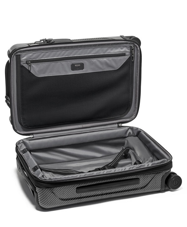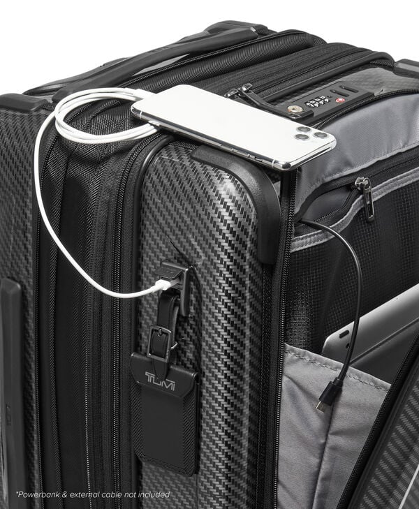 The TUMI Tegra Lite International Front Pocket Expandable is a quality suitcase designed to meet the needs of travelers who require sufficient storage space for short trips. The suitcase is constructed with TUMI's patented Tegra-Lite material "Tegris", an ultra-durable thermoplastic composite designed to withstand the harshest travel conditions. The suitcase has a spacious main compartment with a divided packing compartment and a compression strap. It also has an external front pocket that is easy to access. The suitcase has a built-in USB port so you have the option to charge your devices on the go as well as four dual spinner wheels that provide a smooth and comfortable roll, and a telescoping handle that can be locked in three different positions, making it comfortable for travelers of different heights to use. The suitcase can be expanded up to 5 centimeters for additional packing space via the exterior zipper. In addition, the suitcase has a built-in TSA-approved combination lock for increased security and an integrated suitcase tag on the side. All in all, the TUMI Tegra Lite International Front Pocket Expandable is a well-designed and durable luggage for shorter trips that combines style, functionality and durability to make your travel experience enjoyable for years to come. The suitcase is made in Thailand.